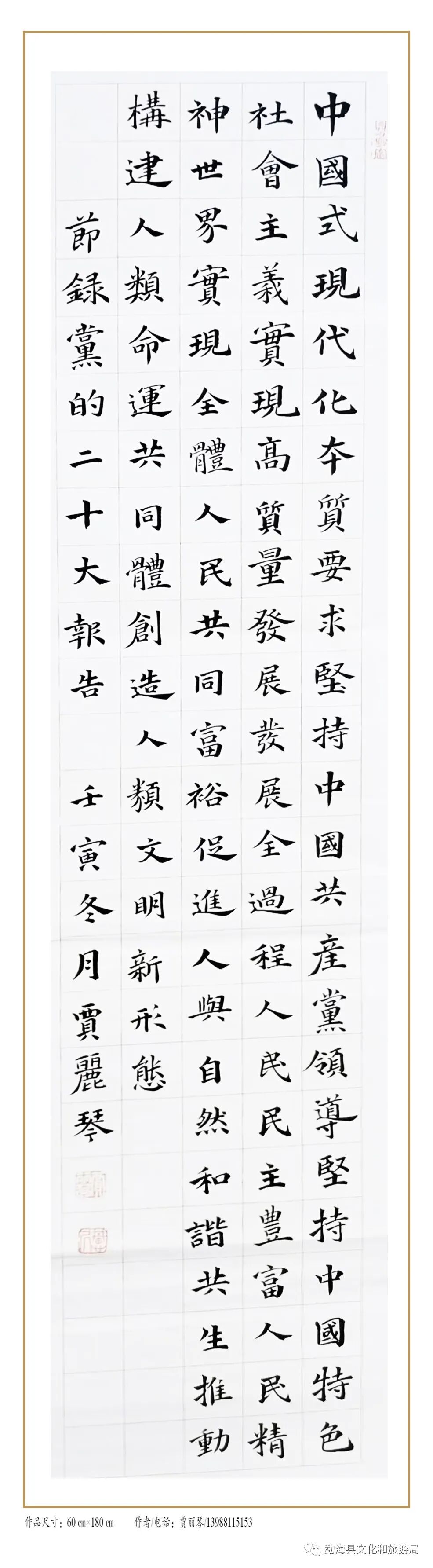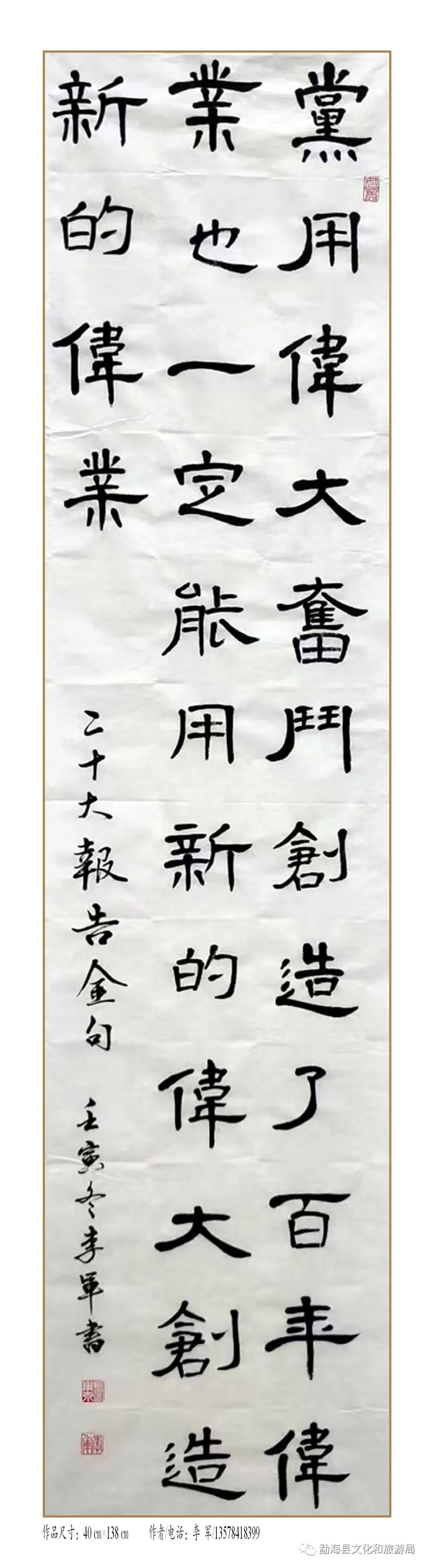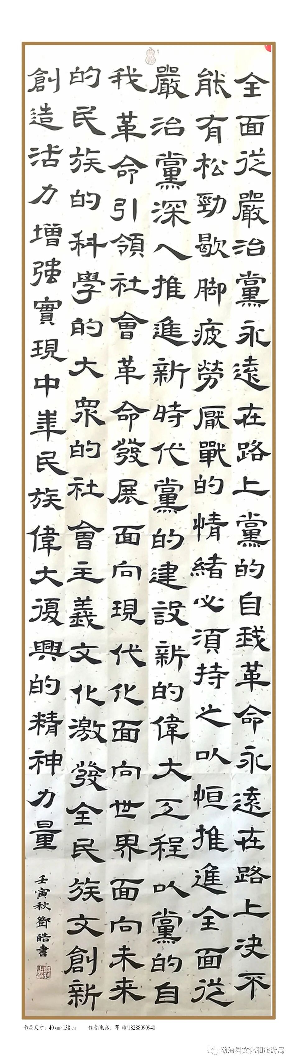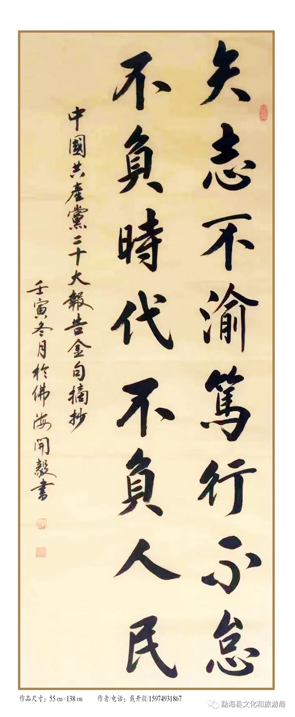 由勐海县文化和旅游局主办、勐海县文学艺术界联合会承办的“礼赞新时代·奋进新征程”书法作品网络展已于11月30日正式上线,将通过“云南公共文化云”“西双版纳掌上文旅”“春韵勐海”“勐海县文化和旅游局”“艺韵茶乡”等网络媒体相继进行线上展览。