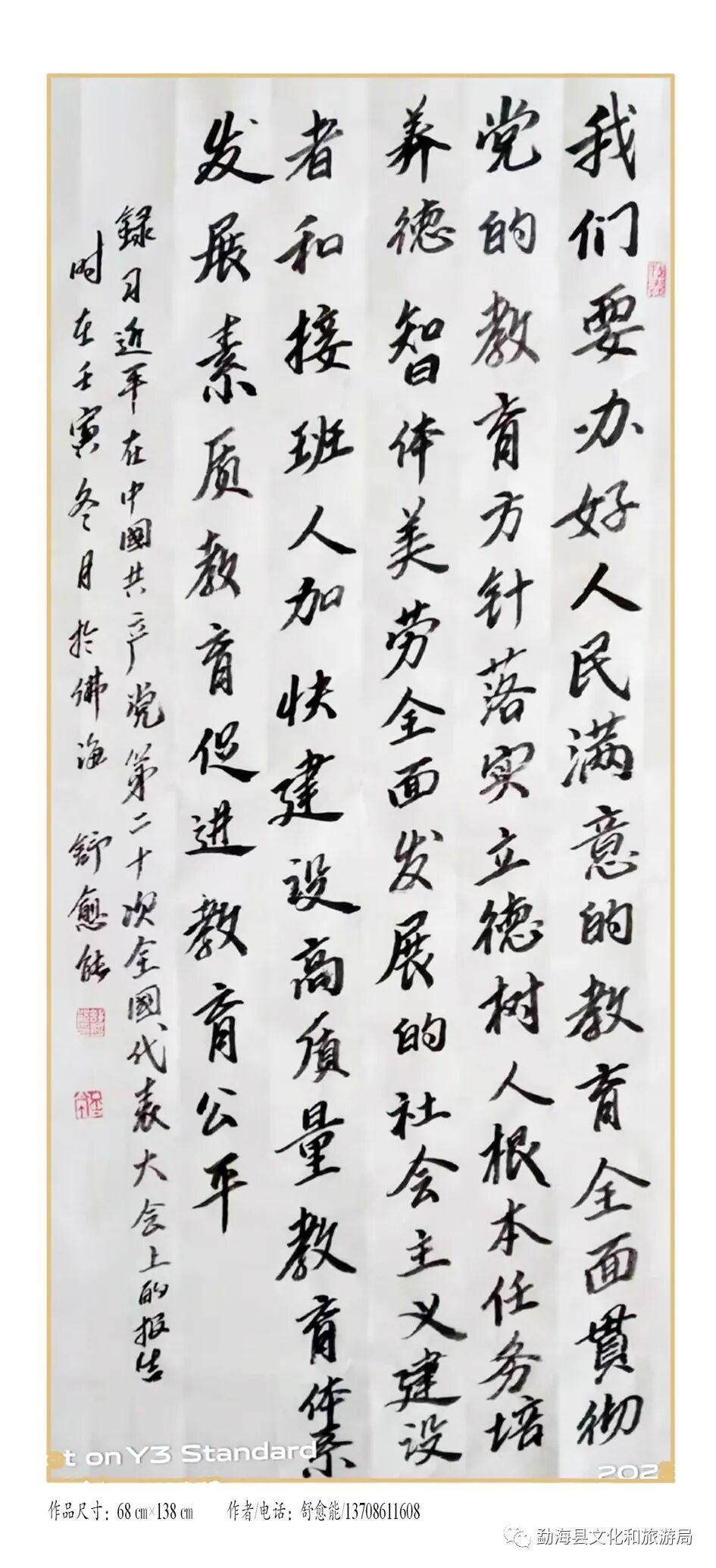 记者了解到,本次书法作品网络展出的作品中,主要由勐海县的书法爱好者以党的二十大报告为主要内容创作的书法作品为主。展览共征集书法作品68件,通过评审后,最终展出作品35件。本次展览旨在助力广大党员干部群众全面学习和宣传贯彻党的二十大精神,让大会精神在勐海县落地生根、指引前行。