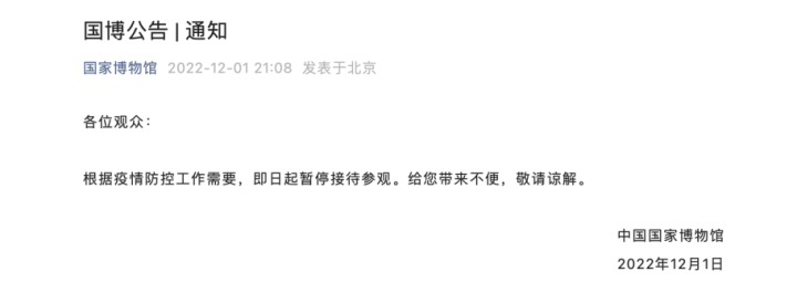 中国国家博物馆12月1日起暂停接待参观 2022-12-02 14:13 中国旅游新闻客户端 0 12月1日,中国国家博物馆发布公告,根据疫情防控工作需要,从当日起暂停接待参观。 (通知截图) 来源 中国旅游新闻客户端 责编 童文文 审核 马永虎