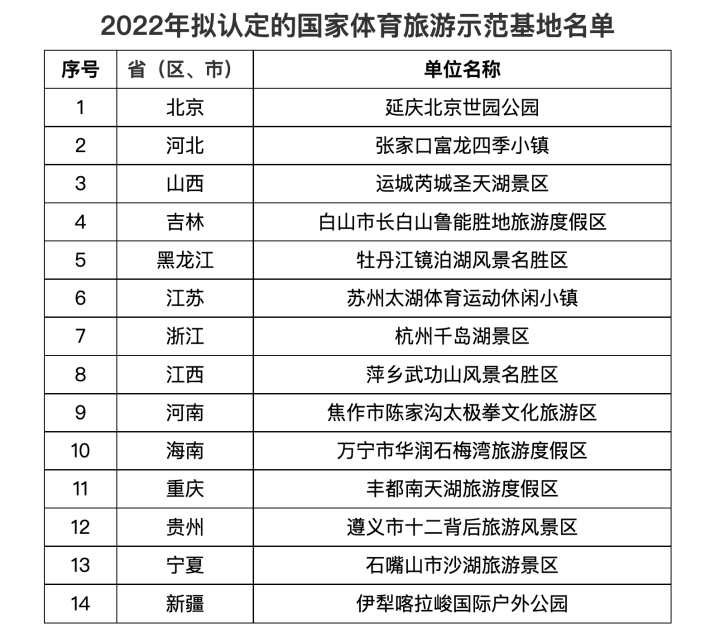 12月2日,体育总局办公厅、文化和旅游部办公厅发布关于拟认定北京世园公园等14家单位为国家体育旅游示范基地的公示。全文如下: