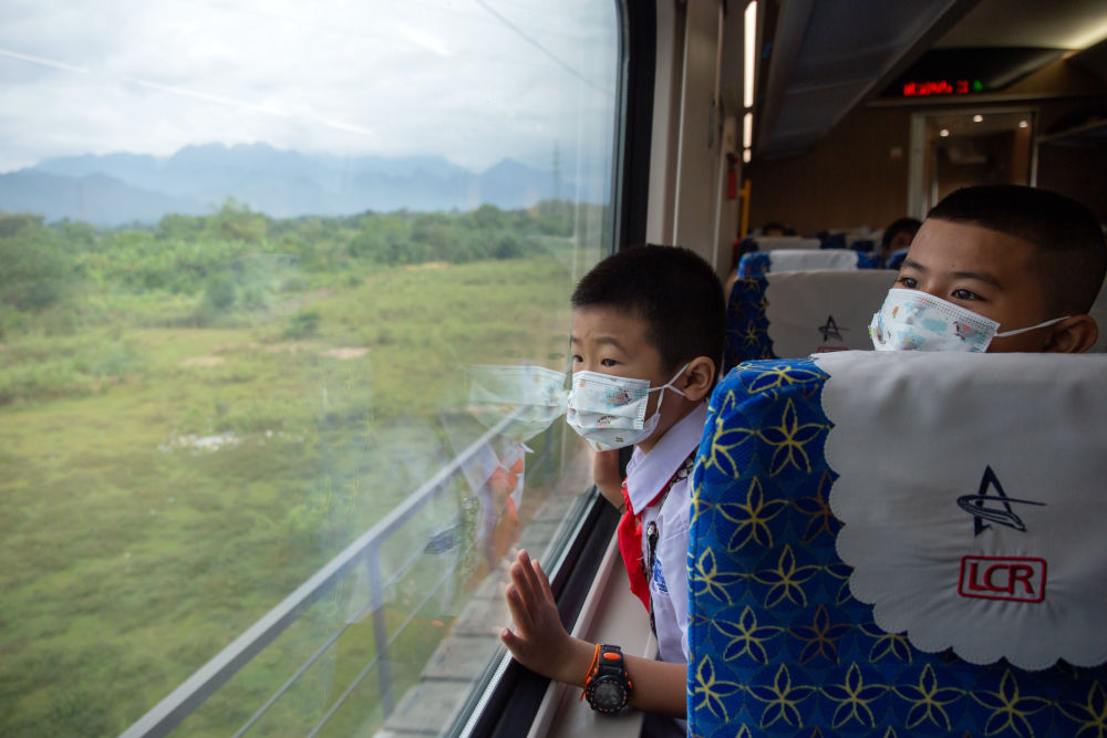 12月1日,中老友好农冰村小学的学生在“澜沧号”动车组上欣赏窗外风光。新华社发(凯乔摄)