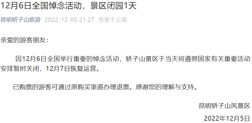 注意!停业1天! 2022-12-06 09:47 昆明世博园、昆明轿子山风景区 0 12月5日 昆明世博园、昆明轿子山风景区 发布公告 12月6日,暂停营业 详情如下↓ 昆明世博园 昆明轿子山风景区 来源:昆明世博园、昆明轿子山风景区 责编 龚怡丹 审核 马永虎