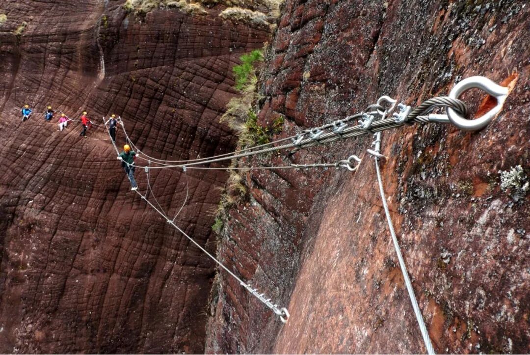 丽江老君山黎明景区在安七尼景点建成的飞拉达铁道攀登项目,总长近千米,设有多条不同难度攀岩路段,天梯、独木桥、猴桥、木吊桥、铁索桥等,感受绕山攀登、树冠行走的乐趣。