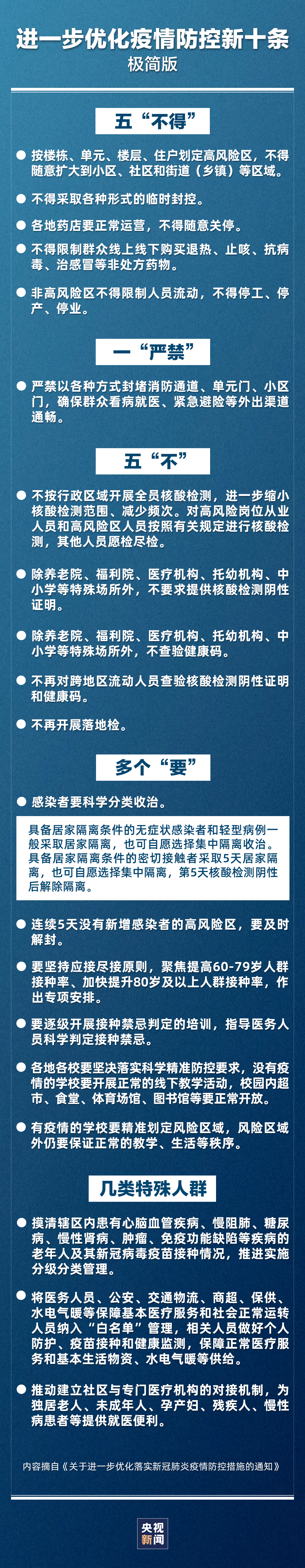 “新十条”极简版来了 2022-12-07 18:28 央视新闻 0 12月7日,国务院应对新型冠状病毒肺炎疫情联防联控机制综合组下发《关于进一步优化落实新冠肺炎疫情防控措施的通知》,一图速览要点→ 来源 央视新闻 责编 龚怡丹 审核 李元