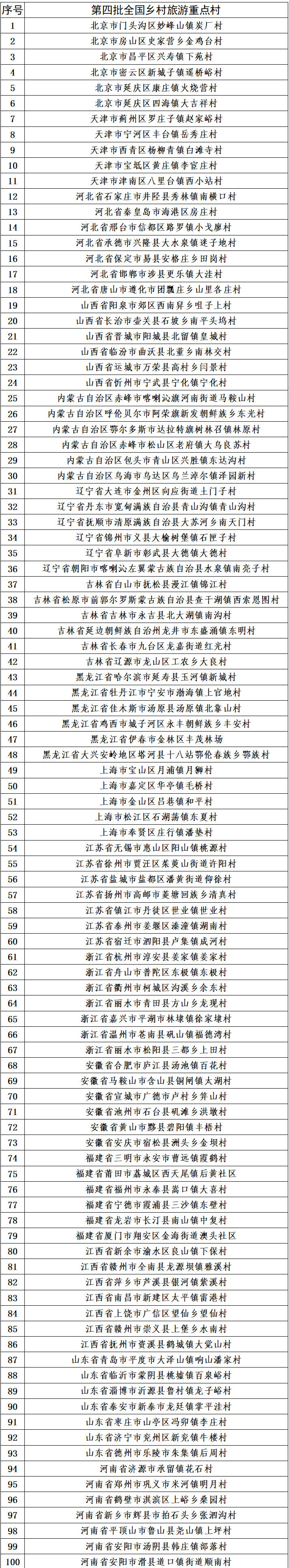 为贯彻落实《中华人民共和国乡村振兴促进法》和《“十四五”旅游业发展规划》相关要求,文化和旅游部、国家发展改革委联合开展了全国乡村旅游重点村镇遴选推荐工作,确定了第四批200个全国乡村旅游重点村和第二批98个全国乡村旅游重点镇(乡)名单,现予公布。