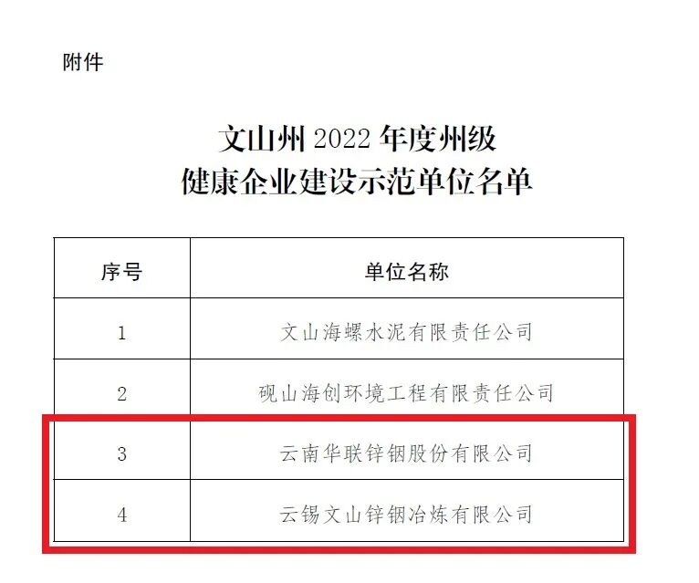 近日,健康文山行动推进委员会办公室下发了《健康文山行动推进委员会办公室关于命名2022年度“州级健康企业建设示范单位”的通知》,云锡文山两公司名列其中。