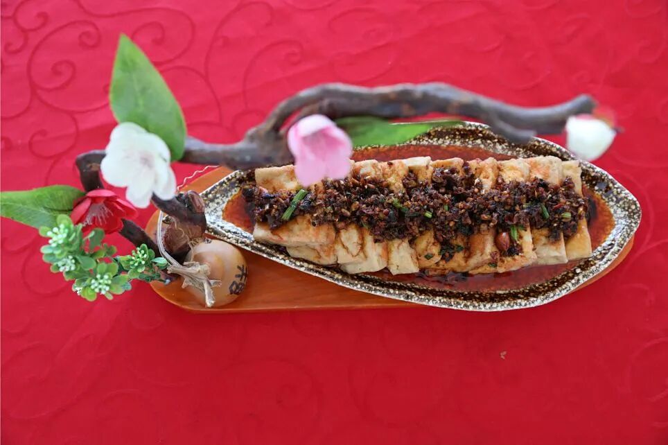 以凤塔村独有的红米长毛谷为主料的菜干饭,传统配料有8种,饭需要煮、蒸、拌、涮4种手艺;汤汁需要舂、炒、搅、剁、拍五道手艺,吃法有干拌和泡汤两种,味道独特鲜美,久久回味无穷。