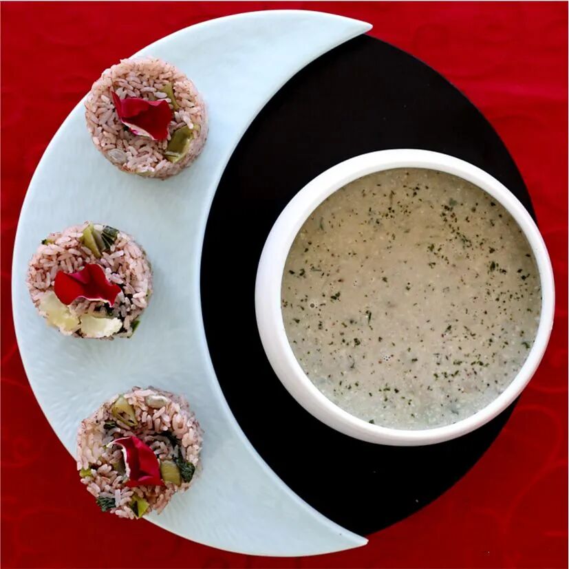 手抓饭选用上好香米和玉米糁等混合在一起煮熟后,在洗净的簸箕内铺满干净的芭蕉叶,将米饭均匀地铺在上面,然后在米饭上分别堆码摆放切好的腊肉、烤小猪肉、火烧鸡、火腿片、清水煮小土豆、玉米、鹌鹑蛋、鸡蛋、时鲜水果等食材,配以腌菜膏、蘸水等特色佐料。这道菜荤素搭配均衡,适合初到怒江的朋友,食材都是当地的绿色食品。