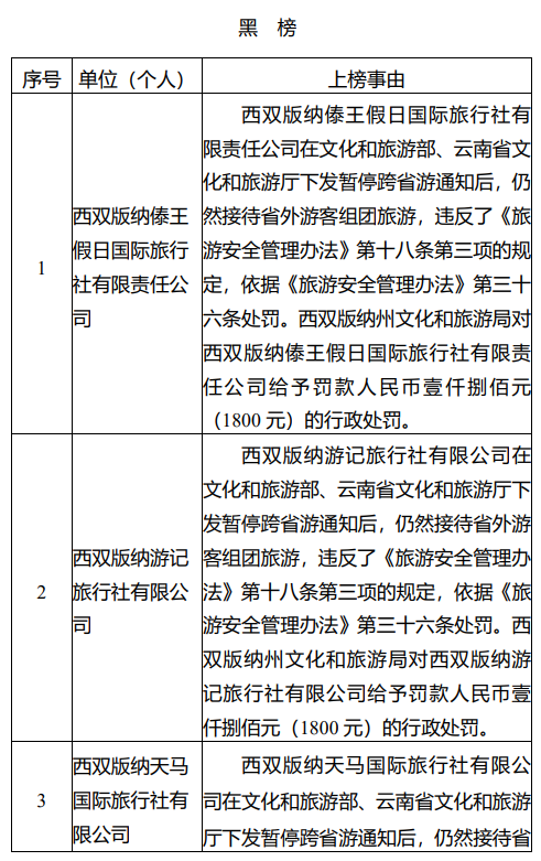 根据《云南省旅游市场秩序整治工作措施》(云政发〔2017〕19号)及《西双版纳州贯彻落实云南省旅游市场秩序整治工作措施实施方案》的要求,现将诚信守法的导游人员纳入红榜,予以通报表扬;将因违反《中华人民共和国旅游法》等法律、法规,受到行政处罚的旅行社及有关人员,纳入黑榜予以通报以示警戒,并纳入重点监管;被吊销业务经营许可证或导游证的单位或个人将列入旅游行业禁入管理。现将“红黑榜”公布如下,接受社会监督。