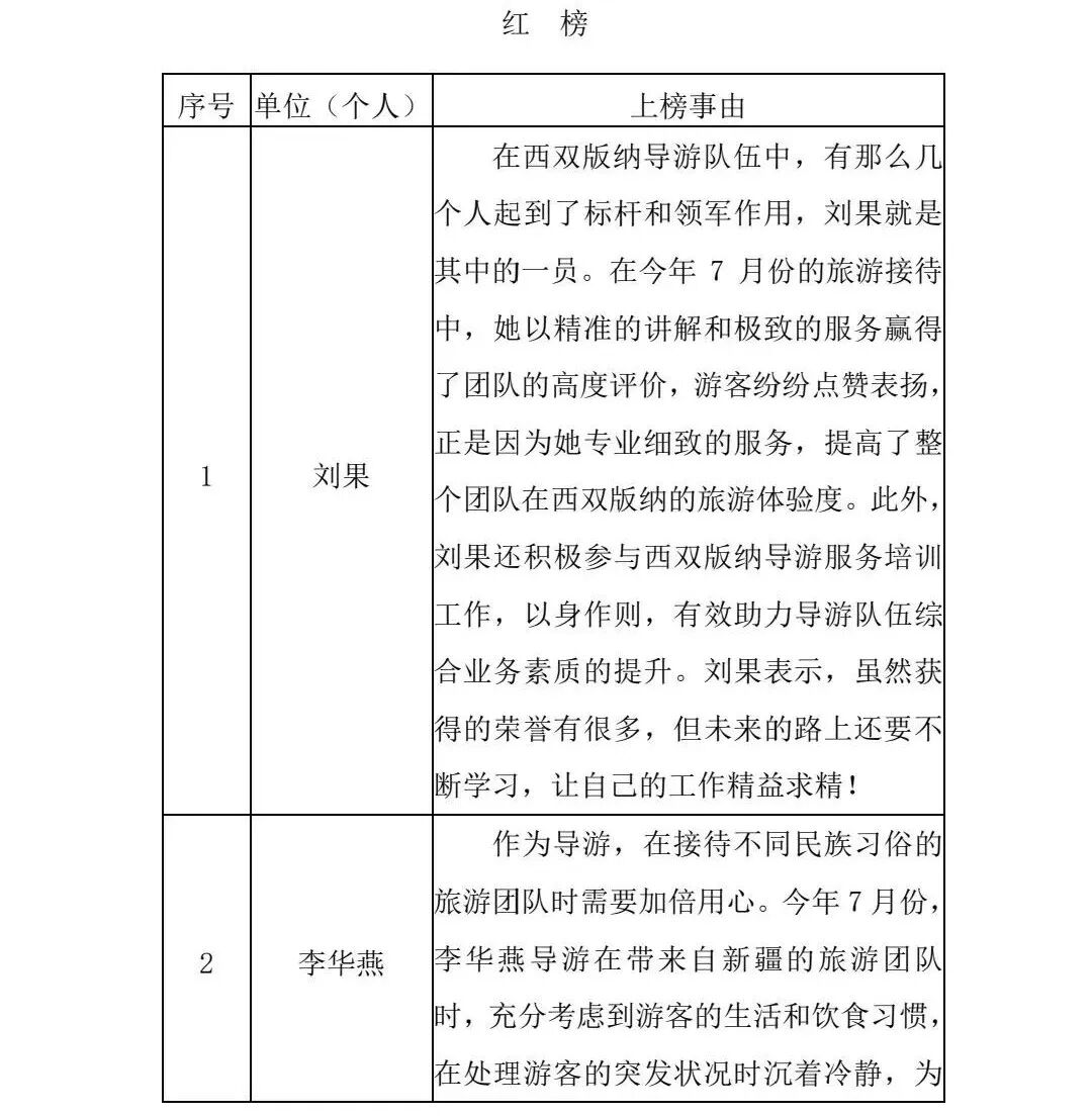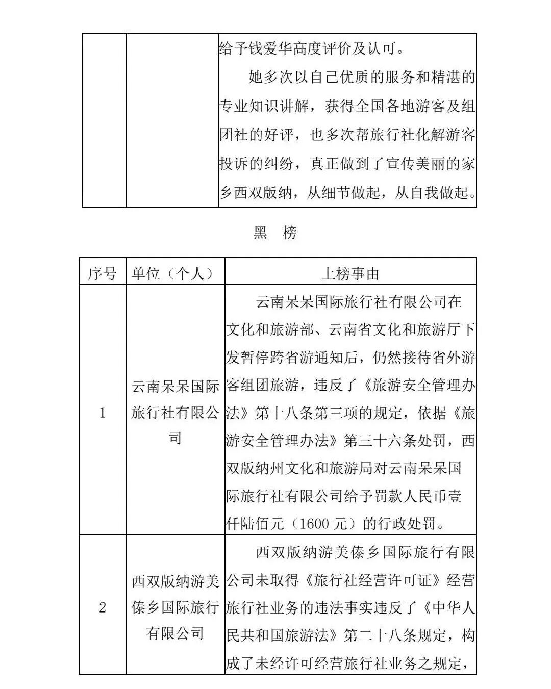 根据《云南省旅游市场秩序整治工作措施》(云政发〔2017〕19号)及《西双版纳州贯彻落实云南省旅游市场秩序整治工作措施实施方案》的要求,现将诚信守法的导游人员纳入红榜,予以通报表扬;将因违反《中华人民共和国旅游法》等法律、法规,受到行政处罚的旅行社及有关人员,纳入黑榜予以通报以示警戒,并纳入重点监管;被吊销业务经营许可证或导游证的单位或个人将列入旅游行业禁入管理。现将“红黑榜”公布如下,接受社会监督。