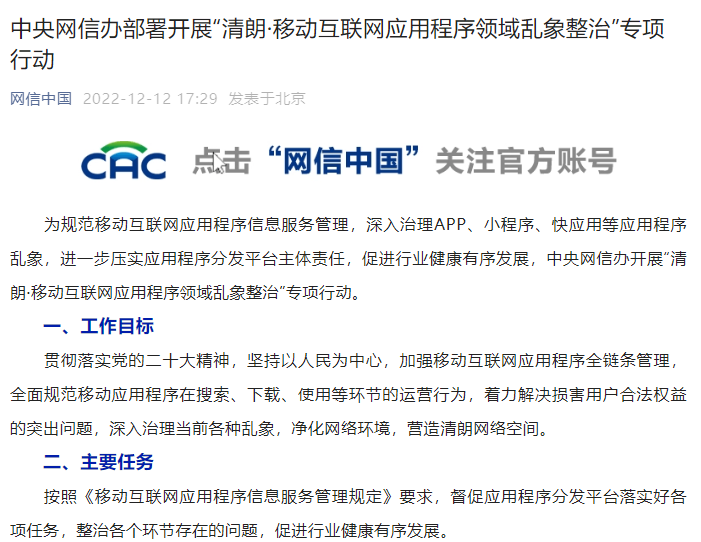 为规范移动互联网应用程序信息服务管理,深入治理APP、小程序、快应用等应用程序乱象,进一步压实应用程序分发平台主体责任,促进行业健康有序发展,中央网信办开展“清朗·移动互联网应用程序领域乱象整治”专项行动。