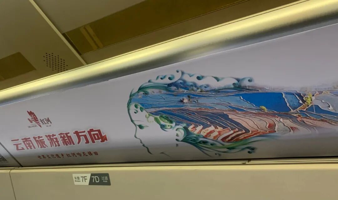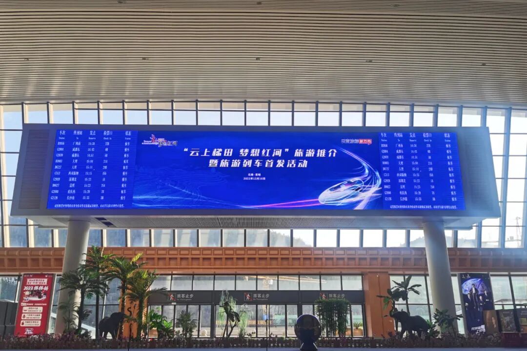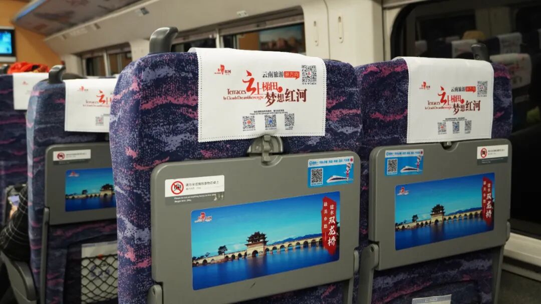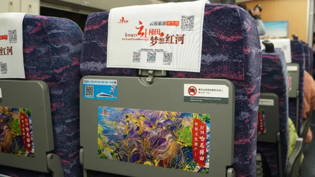 在首发仪式现场,只见红河州旅游列车浸透着浓浓的民族风情,哈尼梯田、特色小镇、古城古桥等极具代表性的自然、人文景观展示在列车LED屏、行李架等地方,列车成为展示红河旅游景点、旅游产品的“移动长廊”,构建了全新的红河文旅宣传矩阵体系。