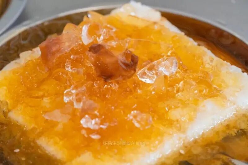 往漂粑上舀点碎冰、芝麻和玫瑰糖水