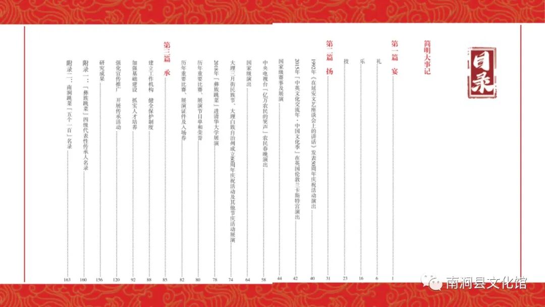 《无量盛宴——南涧县国家级非物质文化遗产项目“彝族跳菜”传承保护纪实》一书,以图文形式记录了自1984年至2022年间跳菜在南涧民间的最初存在形式,到乡土艺术家将民间宴席跳菜提炼成舞蹈艺术搬上舞台、走出南涧、走向世界的发展过程。以及在国家、省、州文化和旅游部门的关怀下,南涧县委、县人民政府高度重视下,一代代文化工作者和跳菜传承人群与社会各界共同努力,让南涧跳菜得到大力传承、不断发展的历程。全书共分为“宴”“扬”“承”三大篇章及附录(国家、省、州、县四级代表性传承人名录和南涧跳菜“五个一百”名录),全面阐述了南涧跳菜的传承保护和发展。