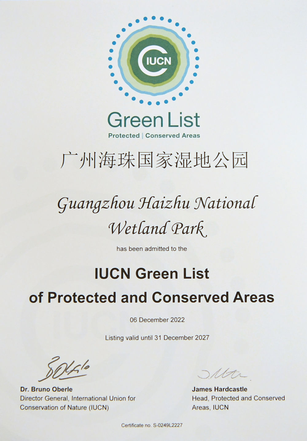 这是在加拿大蒙特利尔拍摄的广州海珠国家湿地公园获得的世界自然保护联盟绿色名录证书(2022年12月14日摄)。新华社记者 任鹏飞 摄