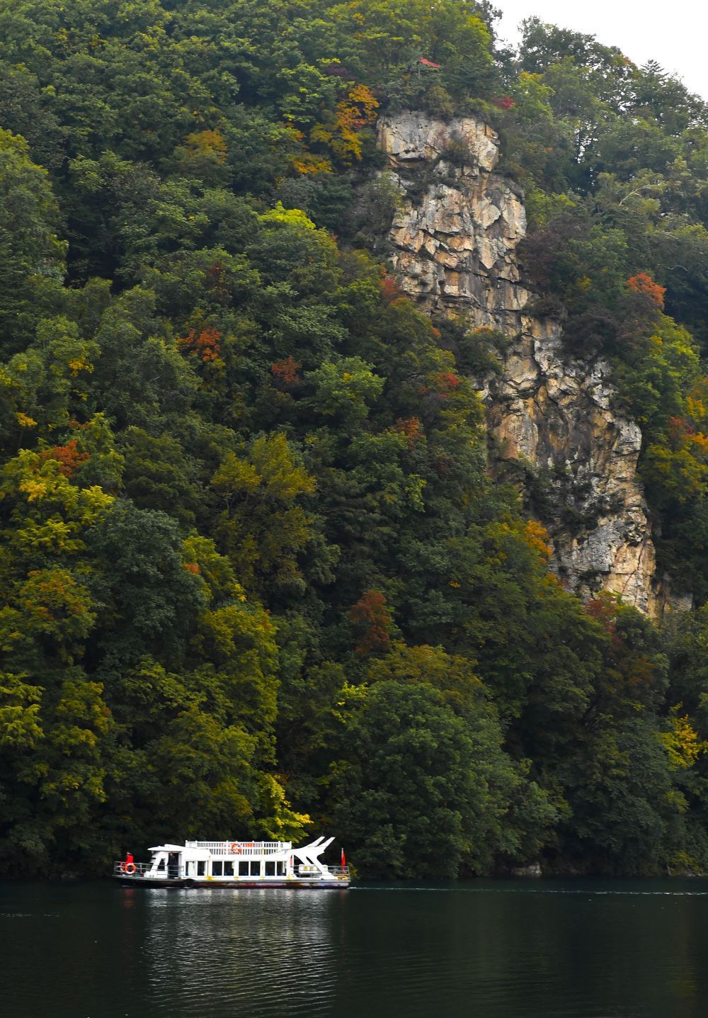游人乘坐游船在吉林龙湾群国家森林公园内游玩(2020年9月22日摄)。新华社记者 许畅 摄