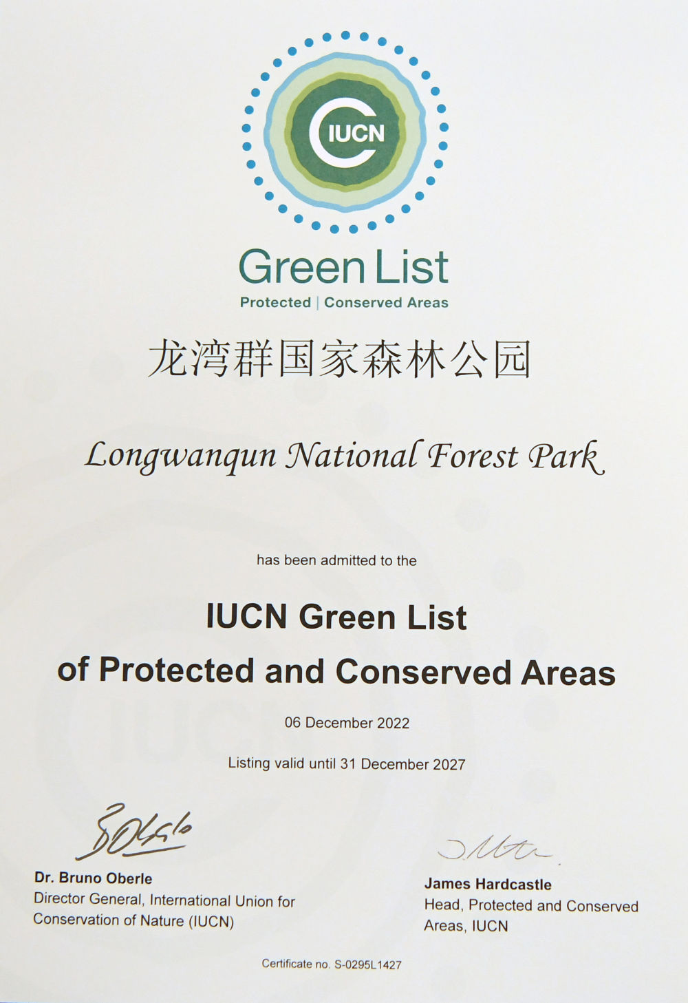 这是在加拿大蒙特利尔拍摄的湖南壶瓶山国家级自然保护区获得的世界自然保护联盟绿色名录证书(2022年12月14日摄)。新华社记者 任鹏飞 摄