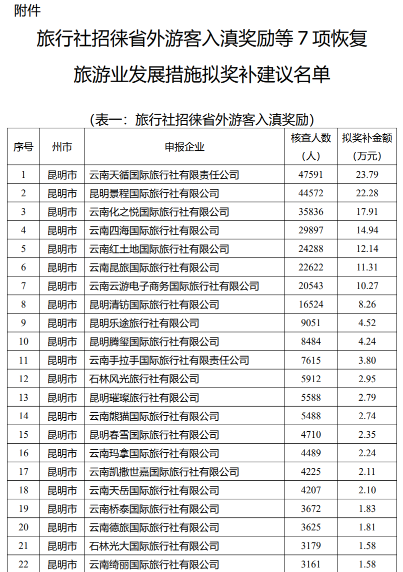 关于旅行社招徕省外游客入滇奖励等7项恢复旅游业发展措施拟奖补名单的公示