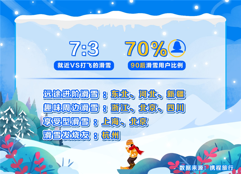 无滑雪,不冬天。随着各地雪场陆续开板,冬季冰雪消费也拉开序幕。从携程平台数据看,元旦就近滑雪、打飞的去滑雪的比例为7:3,90后滑雪比例达到新高,接近70%。从热门目的地看,远途进阶滑雪目的地被东北、河北、新疆包揽,趣味周边滑雪目的地包括浙江、北京、四川等,仅浙江安吉一地,就有两个滑雪场入围全国热门滑雪场TOP10。