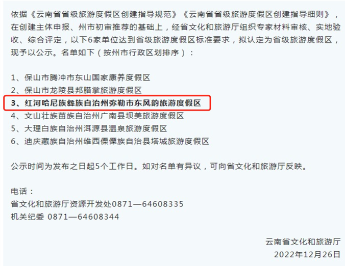 近日,云南省文化和旅游厅发布拟认定6家单位为省级旅游度假区的公示。其中,弥勒东风韵拟认定为省级旅游度假区。