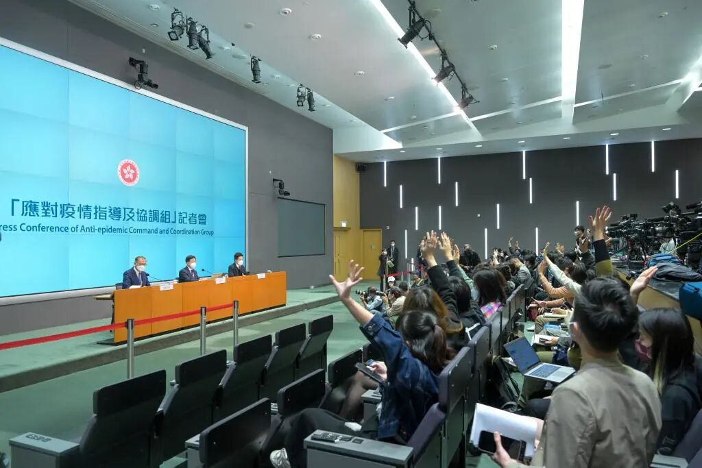 香港特区行政长官李家超当天带领特区政府医务卫生局局长卢宠茂、卫生署卫生防护中心总监徐乐坚在特区政府总部举行“应对疫情指导及协调组”记者会,公布翌日起生效的4项防疫新措施: