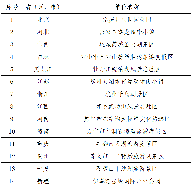 根据《体育总局办公厅 文化和旅游部办公厅关于开展2022年国家体育旅游示范基地申报工作的通知》(体经字〔2022〕207号),在各省(区、市)体育行政部门、文化和旅游厅(局)推荐申报基础上,体育总局、文化和旅游部组织专家评审和现场评估,经社会公示后,现认定北京世园公园等14家单位为国家体育旅游示范基地(名单附后)。