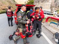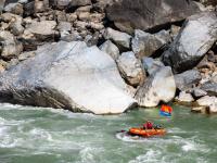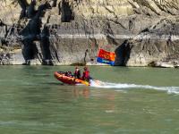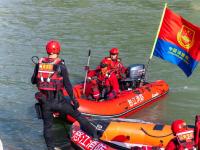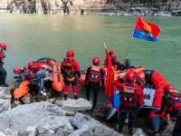 “中国交建杯”2022中国·怒江皮划艇野水公开赛老虎跳挑战赛今天试训。大清早,怒江州消防救援支队碧江路特勤站政治指导员和禹希就带着队员乘着冲锋舟登上激流中的礁石,为即将下水试训的运动员保驾护航。(文旅头条融媒体记者 邓斌 摄)