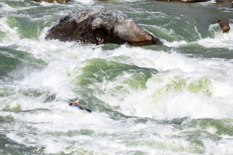 山西队的满鹏被急浪打了个侧翻,虽奋力搏击,还是难逃覆顶之“灾”,黄色小艇船底朝上,把他整个罩在急流之下。岸上的人惊呼起来,瞬间难以呼吸。还好只是几秒,满鹏重新转回水面安坐艇上,成功脱险并完成赛段训练。