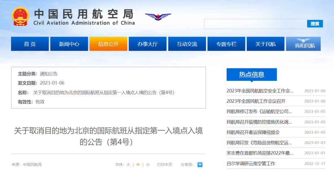 1月6日,民航局发布《关于取消目的地为北京的国际航班从指定第一入境点入境的公告》。详情如下: