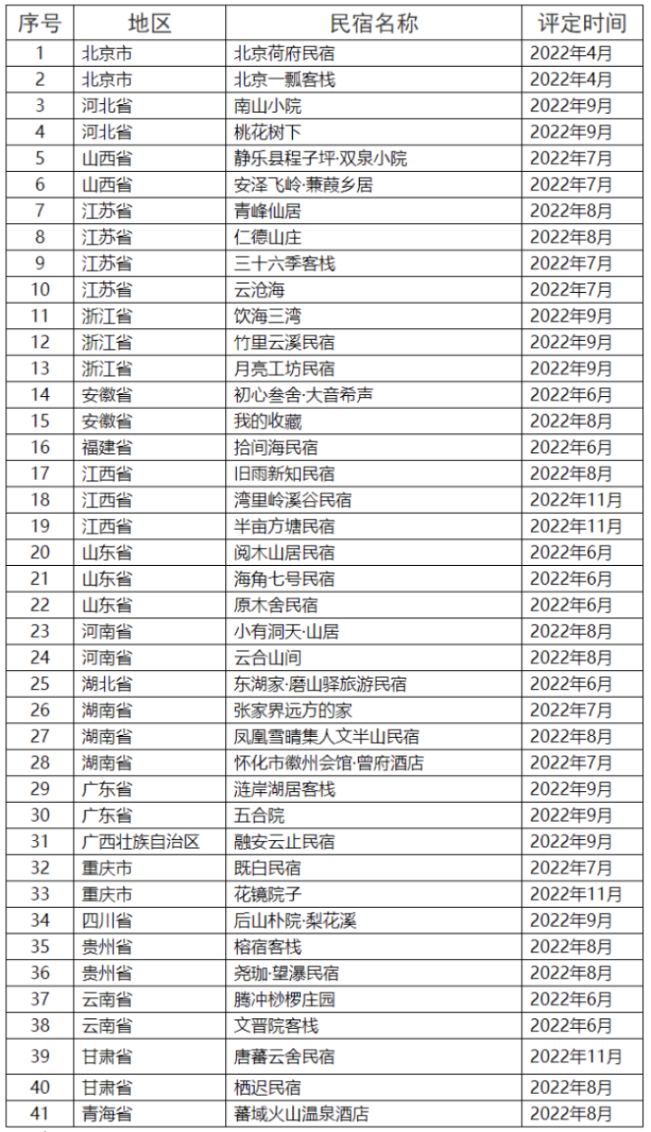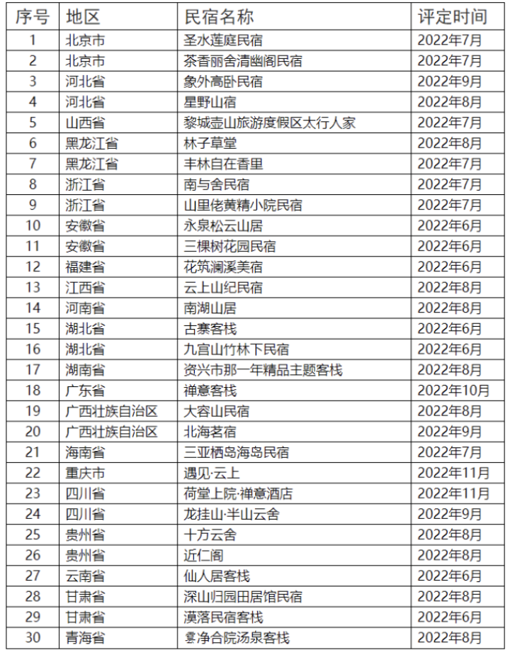 经旅游民宿自愿申报、省级等级旅游民宿评定机构初审,全国旅游标准化技术委员会最终评定后,认定71家民宿基本达到甲级、乙级旅游民宿标准。根据《<旅游民宿基本要求与评价>(LB/T 065-2019)及第1号修改单实施工作规程》,现公示如下: