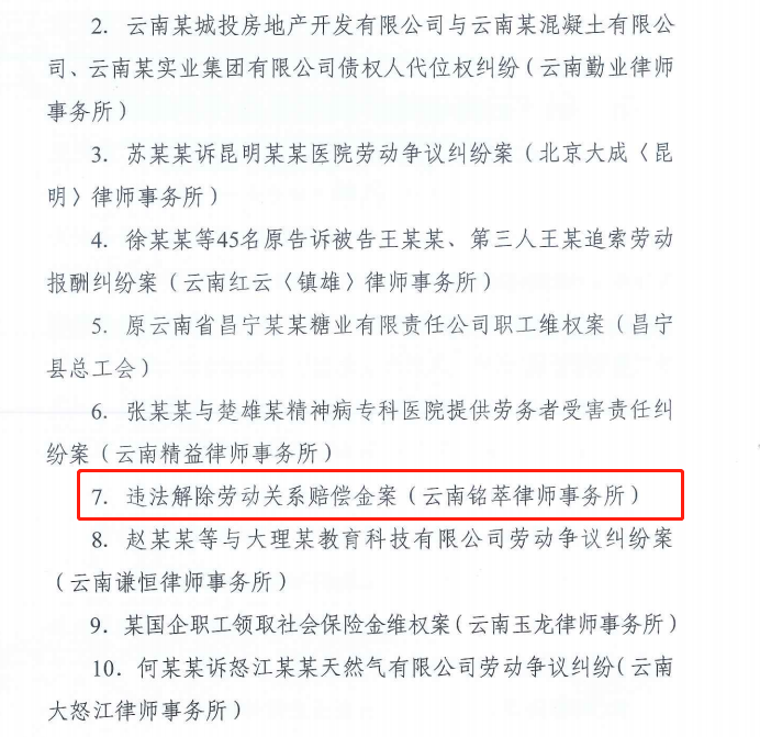 在红河州推荐的3名律师、2个典型案例中,云南众序律师事务所肖建伟律师荣获“云南省维护职工权益杰出律师”称号,云南铭萃律师事务所“违法解除劳动关系赔偿金案”被选树为“云南省维护职工权益典型案例”。