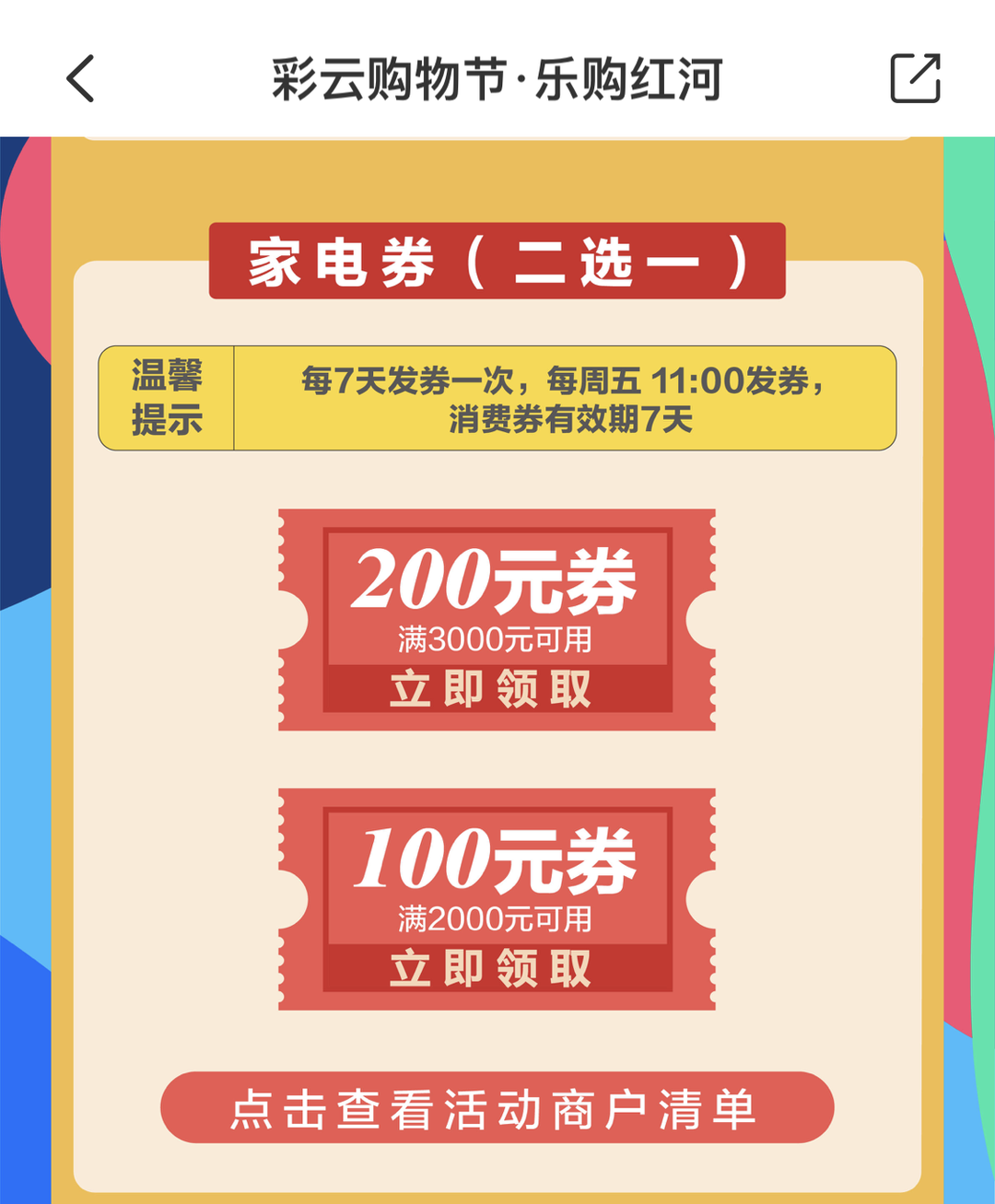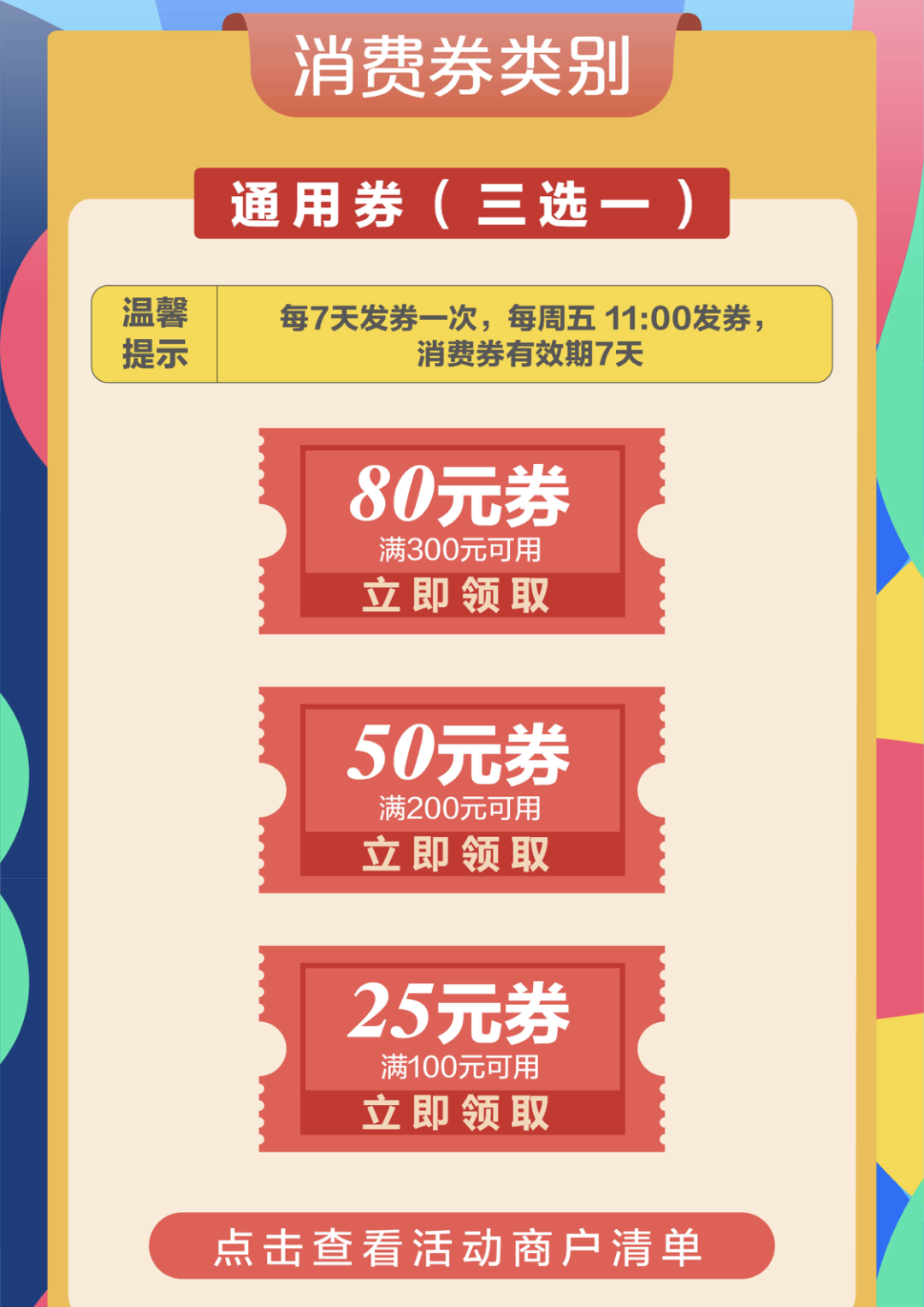 抢券时间:每周五11:00发券,消费券有效期7天。