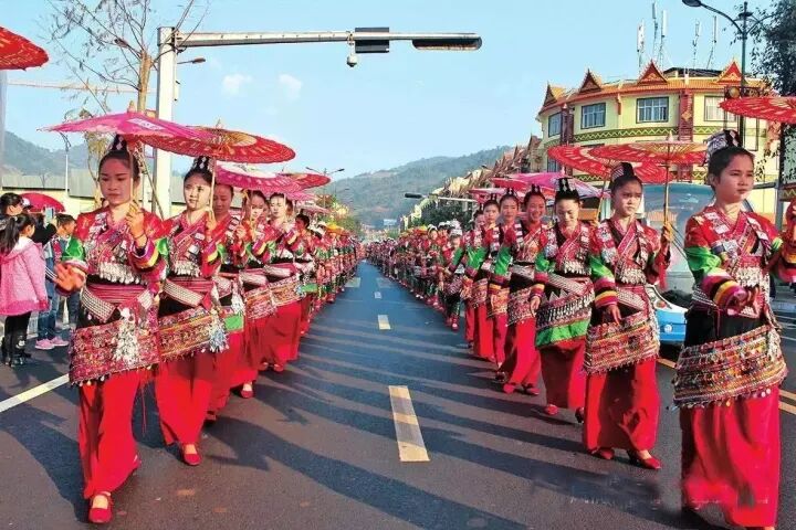 内容:千名花腰傣群众着花腰傣服饰展示“满城尽是花腰傣”的壮观景象。