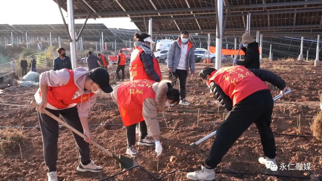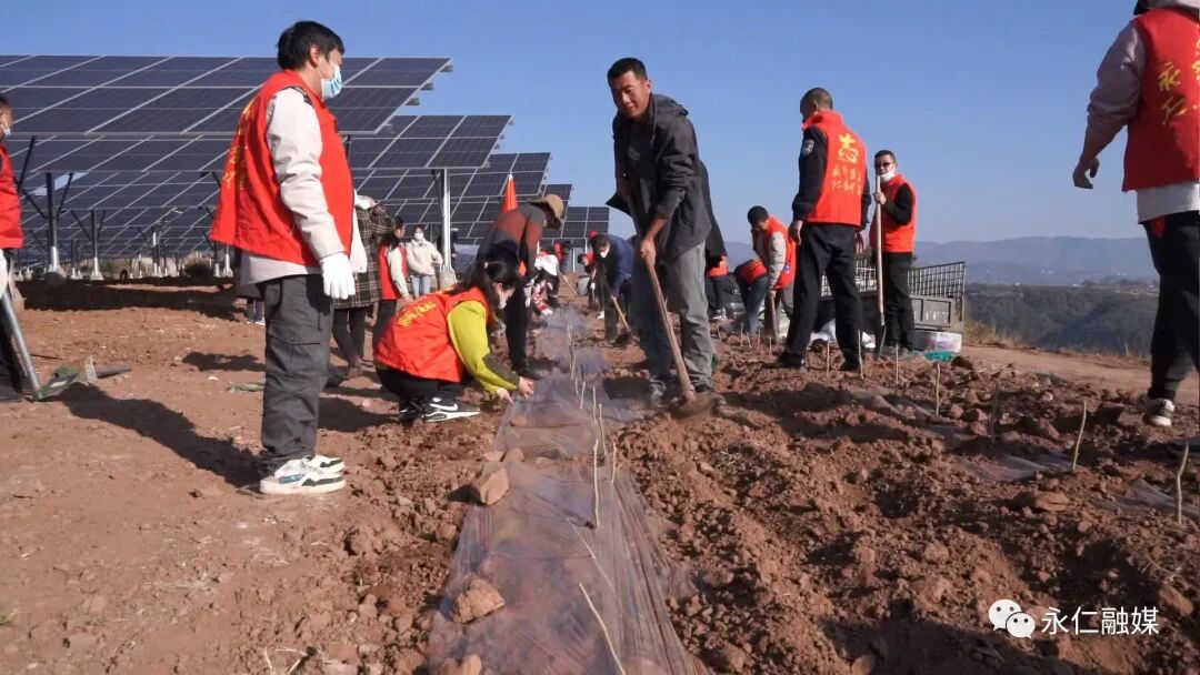 走进楚雄州永仁县维的乡立竜村委会立竜光伏电站,延绵的光伏板在晨曦的照耀下熠熠生辉,光伏板下,来自维的乡的干部职工以及立竜村的部分群众共100余人身着志愿服,手拿锄头、铁锹正热火朝天地种下一排排桑苗,仅需3、4个月,这些桑苗就能茁壮成长,带来经济效益。