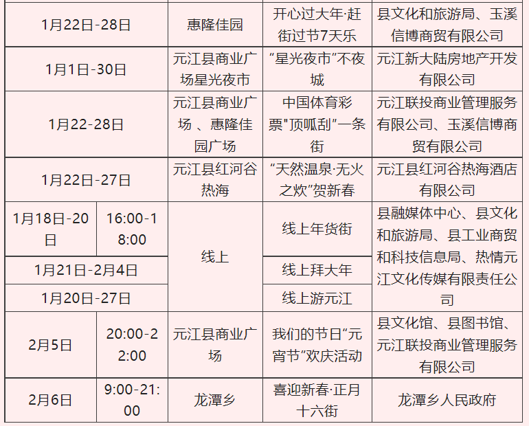 活动内容:相聚元江街子逛年货街,品元江特色美食,开展电商直播带货等。