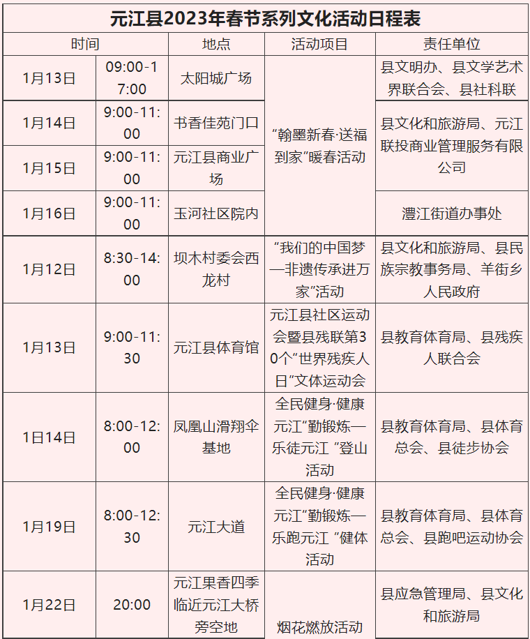 为弘扬中华优秀传统文化,丰富活跃群众节日文化生活,营造深厚的节日文化氛围,2023年春节期间,玉溪市各县区推出了内容丰富、形式多样的春节系列活动,囊括文化、艺术、美食、非遗、民俗等元素,为市民献上新春文化盛宴。元江县春节都有哪些精彩的活动呢?一起来看看吧!