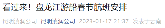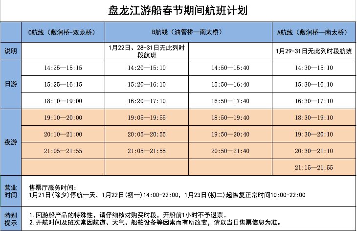 盘龙江游船售票厅服务时间 1月21日(除夕):停航一天1月22日(初一):14:00-22:001月23日(初二)起恢复正常时间:10:00-22:00