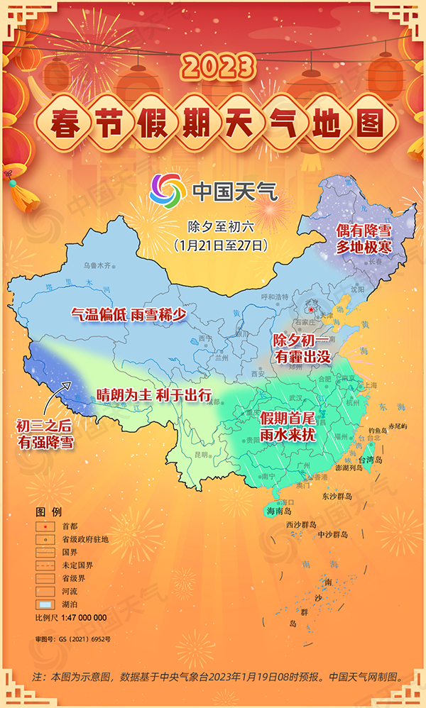 1月19日上午,中央气象台正式发布春节假期天气预报,预计2023年春节假期(除夕至初六)我国无大范围低温雨雪冰冻等灾害天气,冷空气活动较为频繁,中东部地区气温波动较大,内蒙古东部、东北一带气温偏冷明显,部分地区将现极寒。南方多地雨水中迎新春,除夕、初一及初五前后会有阴雨,需注意出行安全。