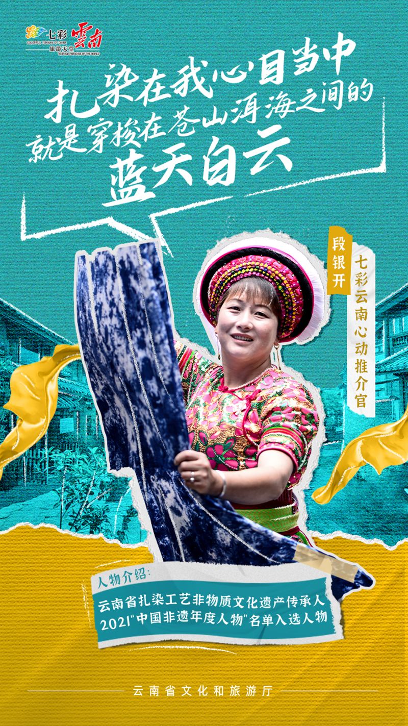 云南灿烂的民族文化魅力和活力,既因为绵延不断的传承,也缘于生生不息的创新。云南大理非遗传承人段银开,是2021“中国非遗年度人物”名单入选人物。从小生长在云南大理喜洲镇白族扎染世家的段银开,在父辈的影响下学习传统扎染技艺并积极创新产品。2012年,筹建了以白族民居“三坊一照壁”“四合五天井”为基本建筑形式的大理扎染博物馆,经常举办各种扎染技艺培训班及扎染体验活动,多形式传承和发扬大理扎染技艺。