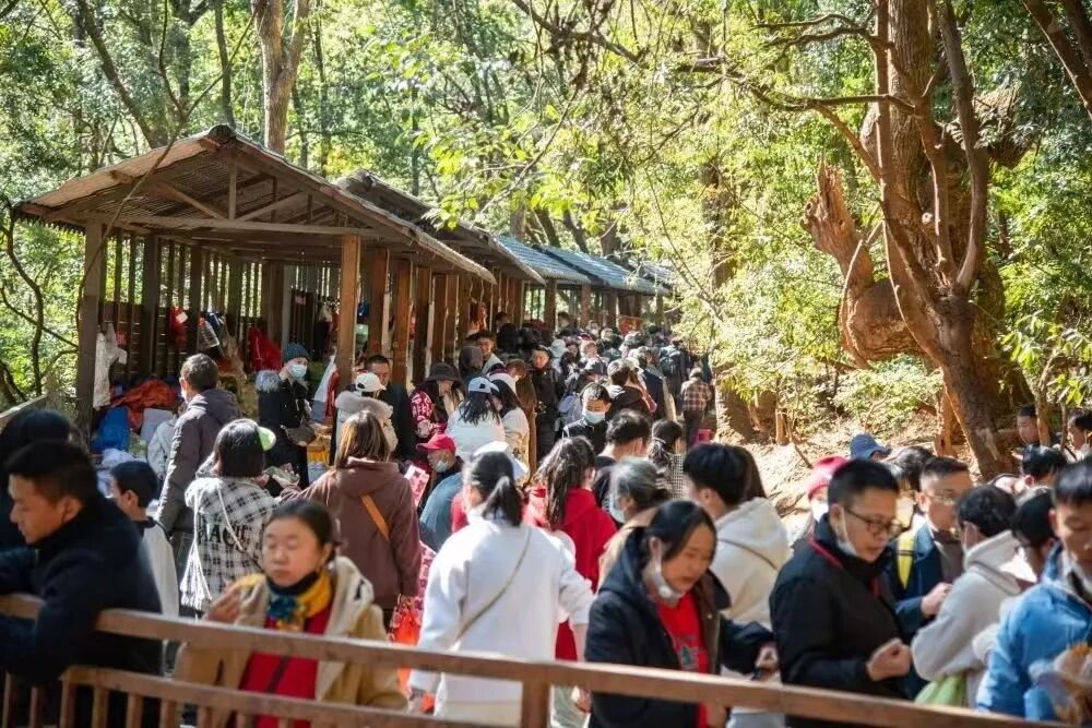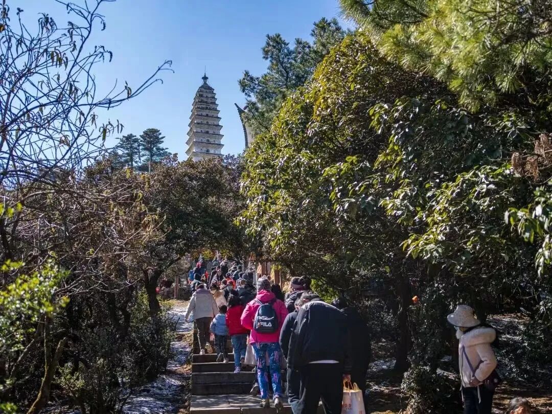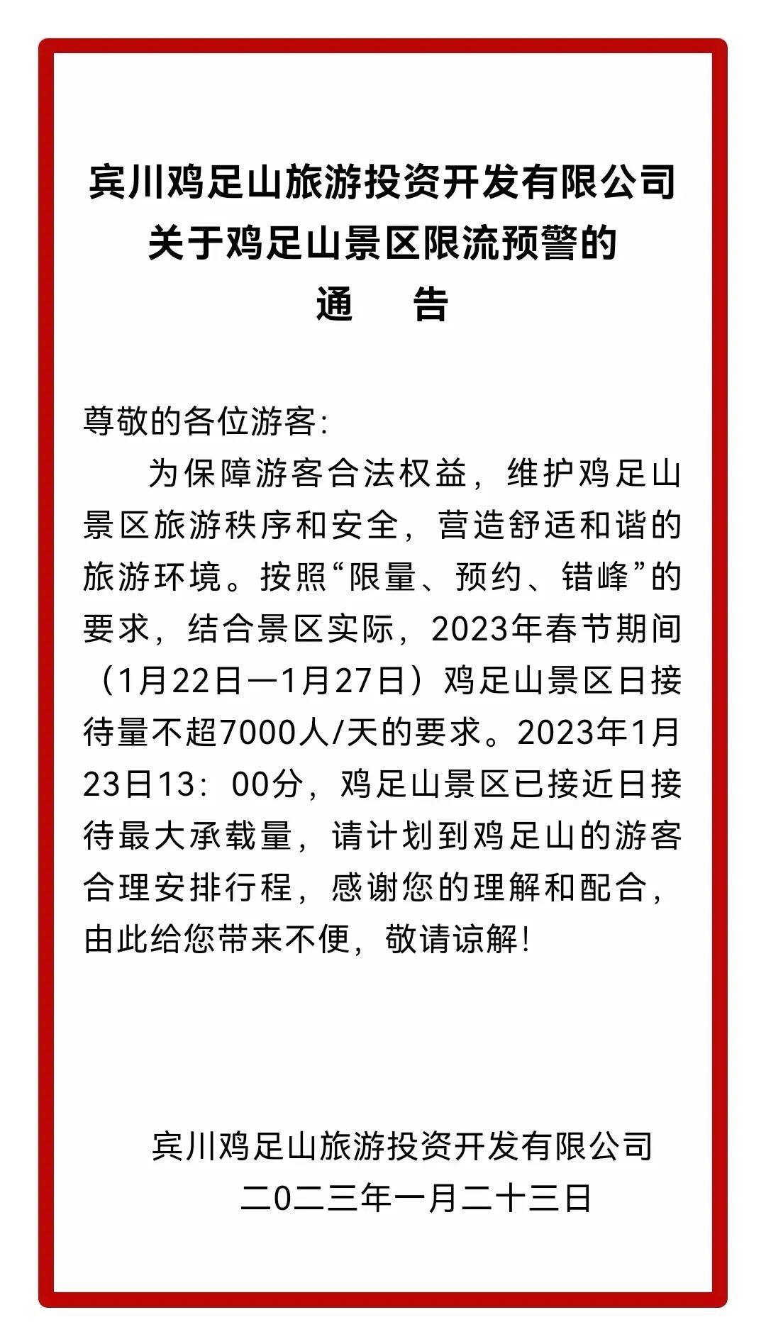 宾川鸡足山景区于大年初一、初二分别发布限流预警的通告,2023年1月22、23日13:00分,鸡足山景区已接近7000人/天的日接待最大承载量。