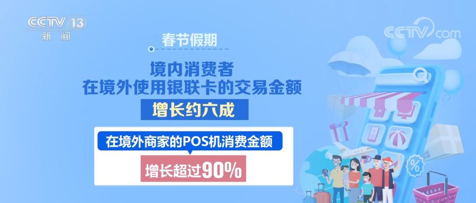 央视网消息:银联国际最新数据显示,春节假期,境内消费者在境外使用银联卡的交易金额增长约六成。其中,在境外商家的POS机消费金额增长超过90%;港澳地区和东南亚等近程市场是最受青睐的目的地。