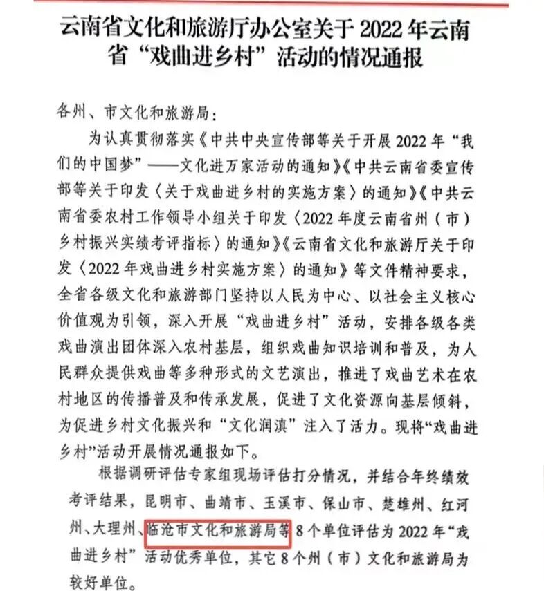 日前,云南省文化和旅游厅公布全省2022年“戏曲进乡村”活动优秀单位,根据调研评估专家组现场评估打分结合年终绩效,临沧市文化和旅游局被表彰为“戏曲进乡村”活动优秀单位。