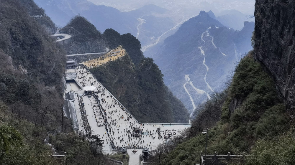 春节期间,各地推出相应措施,保障文旅市场安全、有序。图为在张家界天门山景区排队的游客。新华社记者赵众志 摄