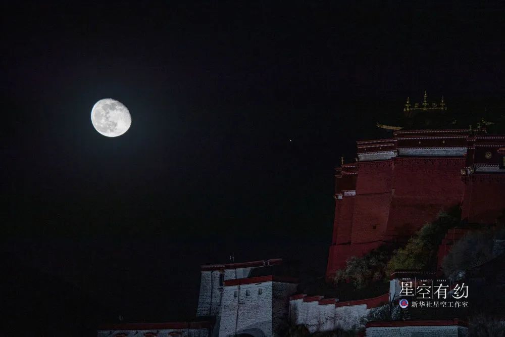 2022年11月11日晚在拉萨布达拉宫附近拍摄的火星合月。新华社记者 孙非 摄