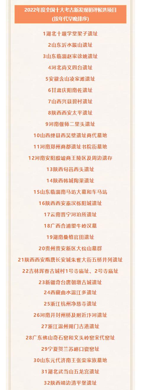 2022年度全国十大考古新发现初评启动 2023-02-03 14:35 央视新闻客户端 0 2月3日,2022年度全国十大考古新发现初评启动。候选项目均为各发掘资质单位主动申报,经国家文物局审核,最终确定32项参评(名单如下)。推介活动办公室将组织投票推荐产生20项进入最后的终评。 来源 央视新闻客户端 责编 龚怡丹 审核 刘娅娟