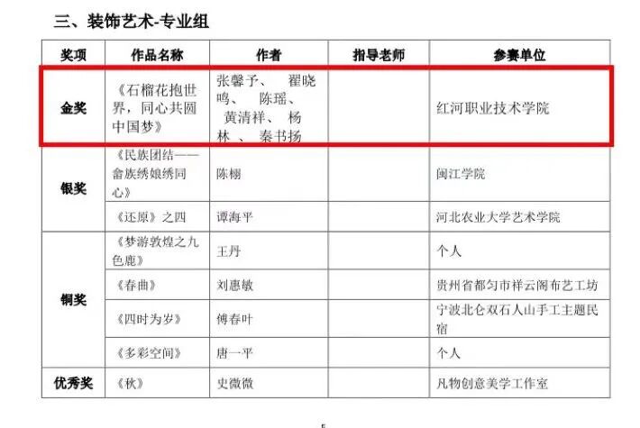 值得一提的是,红河职业技术学院作为非物质文化遗产职业教育专业委员会委员单位,一直致力于让非遗走进校园,将红河州的非物质文化遗产与教学相结合,专门设立工作室和学院来保护传承当地非物质文化遗产。树立学生的文化自信,增强传承传播责任。此次获奖作品《石榴花抱世界,同心共圆中国梦》主创人员中的张馨予老师,也是一位奋斗在非遗传承路上的优秀教师。