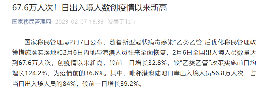 国家移民管理局2月7日公布,随着新型冠状病毒感染“乙类乙管”后优化移民管理政策措施落实落地和2月6日内地与港澳人员往来全面恢复,2月6日全国出入境人员数量达到67.6万人次,创疫情以来新高,较前一日增长32.8%,较“乙类乙管”政策实施前日均增长124.2%,为疫情前的36.6%。其中,毗邻港澳陆地口岸出入境人员56.8万人次,占当日出入境人员的84%,较前一日增长39.2%。