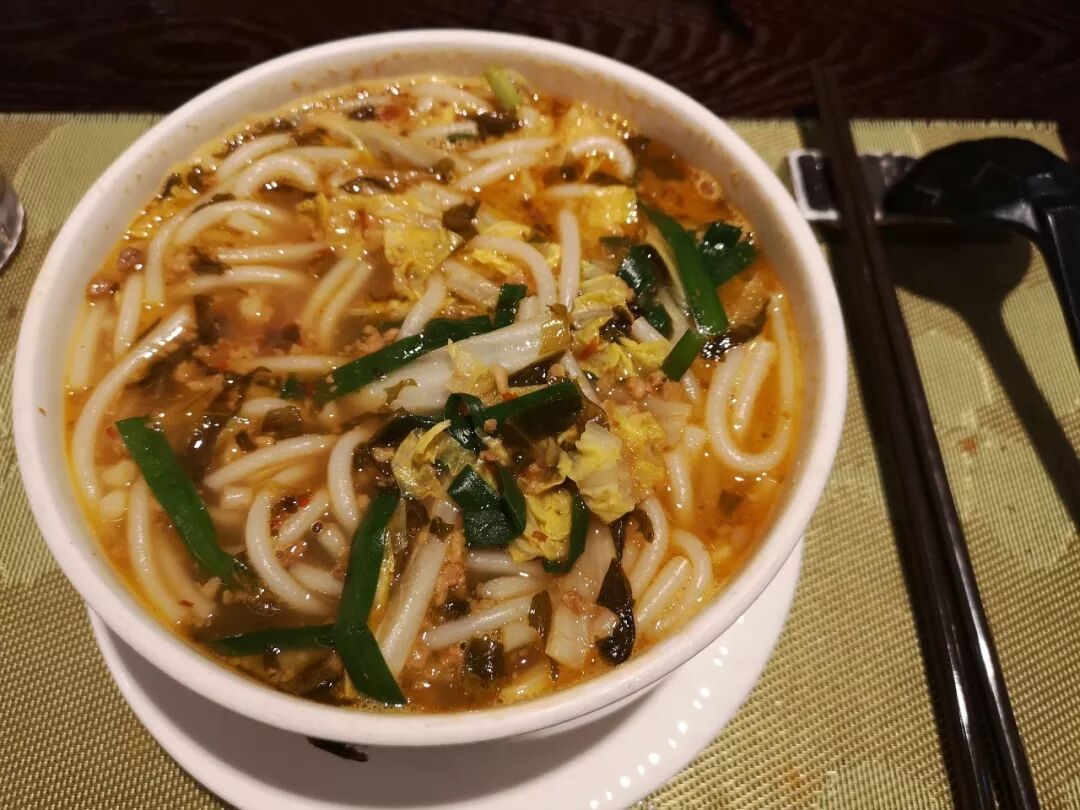独特的“米线+果醋”的吃法,除了米线,还有普洱特色米干。鲜肉沫做帽,小铜锅煮制,加清香的高汤、加翠绿的韭菜,煮出来的小锅米线有着白色略微浓稠的汤汁,或许口味特别淡的人会觉得腻。所以,必须要有秘制果醋的加入才显得完美。