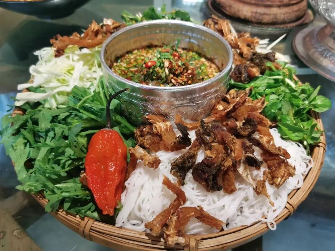 这是一道傣家的经典菜肴,其制作方法繁琐费时又考究,所以美味撒撇米线可谓是可遇不可求。用料新鲜、佐料丰富、汤汁香淳,尝起来口感层次丰富,初食有点微苦再食回味悠甜,要知道撒撇不止美味可口,还有健胃强骨消食败火的功效。