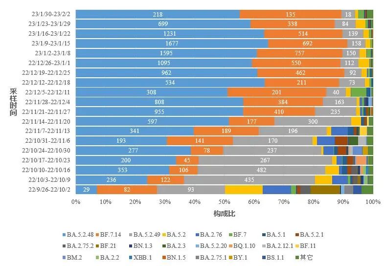 图4-1 全国新型冠状病毒变异株变化趋势图说明:1.采样日期:2022年9月26日至2023年2月2日。 2.图中标记的数字分别为BA.5.2.48、BF.7.14和BA.5.2.49进化分支有效基因组序列数量。 3.“其它”指全国范围Omicron变异株构成比小于0.1%的进化分支。